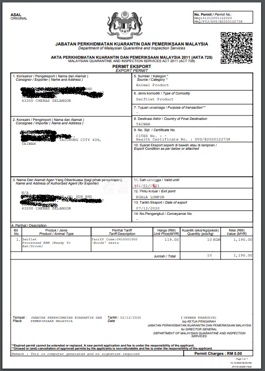 今年的新冠肺炎疫情真是打擊到了馬來西亞的各行各業,燕窩當然也在其中,具體表現就是外勞工人難找,還有就是客戶沒錢了,訂單也多少是有些影響的,但是小曹及我們的工廠還是繼續努力、再接再厲、全力以赴的把事情做好,比如我們的臺灣和日本客戶正常的瓶裝即食燕窩還是可以按規定運作,比如這次的馬來西亞燕窩出口臺灣客戶還是按照之前的樣子做出口,哪怕是在馬來西亞各個政府部門都減少辦公甚至不辦公的情況下還是安排有序出口報關事宜。